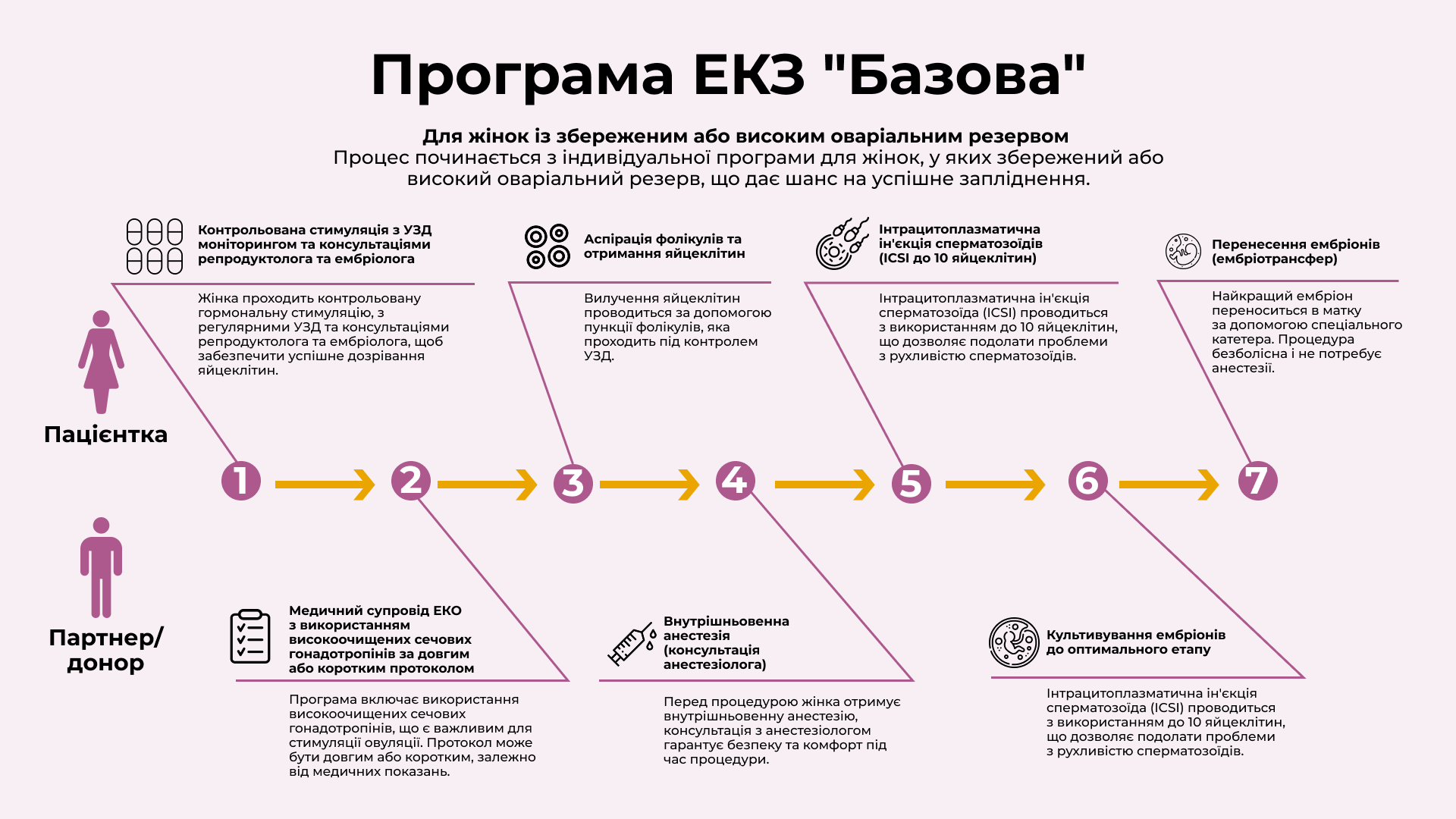 - У базовій програмі є низькі шанси на розвиток синдрому гіперстимуляції яєчників, що робить її безпечною для здоров’я жінки.